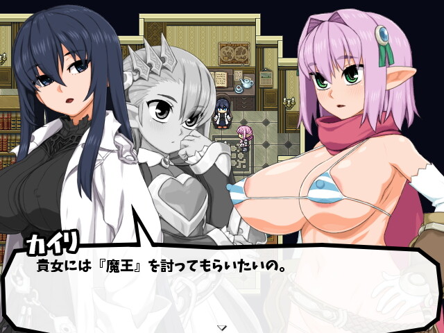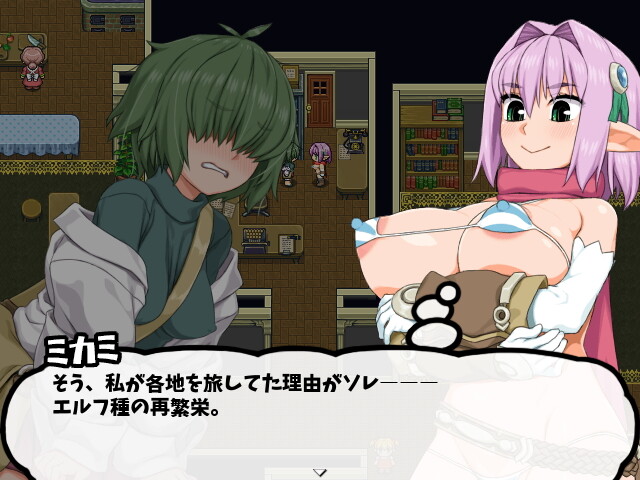エルフに似つかわしくない性欲のミカミは妊娠をしたらすぐに臨月を迎えいつでも出産できるようになる体質です。そのへんを歩いている若い子からヨボヨボのお爺ちゃん、犬にモンスターなどおよそ精子を出せる生き物であれば誰とでもエッチをして子供を産むことができます。出産シーンは設定でスキップ可能です。