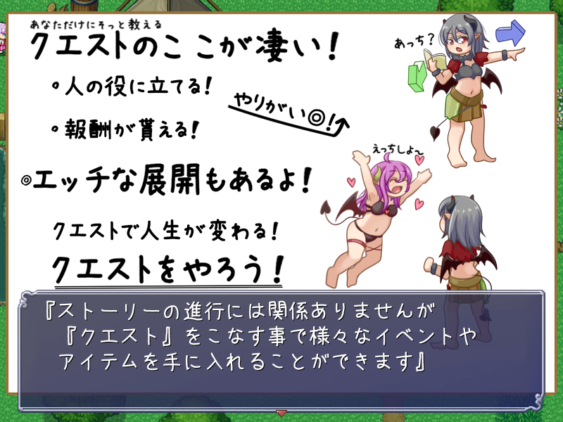 主人公たちが入植している辺境の地は魔王の瘴気によって男性が住みづらく、女性もエッチになってしまう訳アリの土地です。そんな場所での開拓は一筋縄ではいかなく、いつも淫魔や住人が巻き起こすトラブルにてんやわんやです。