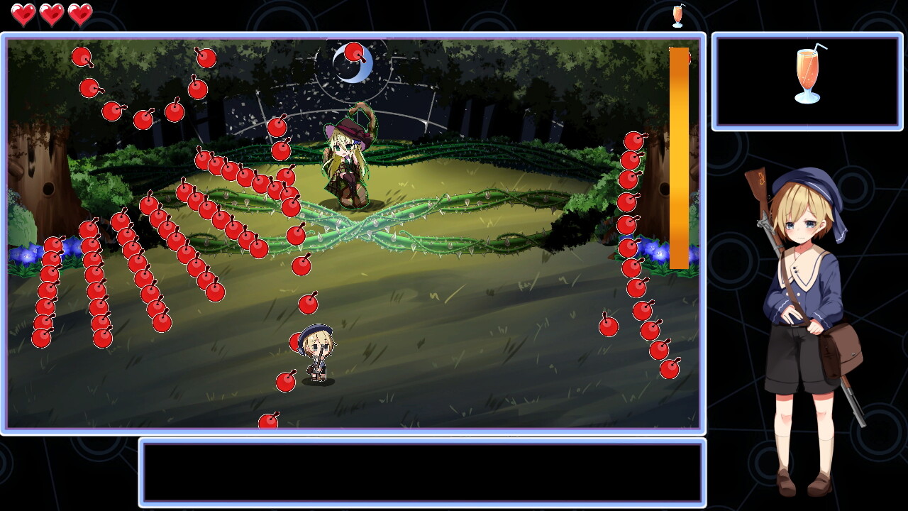 左右の木の根元のリンドウを攻撃することで茨のガードが無くなります。弾幕は素直なので見た目以上に避けるのが簡単です。