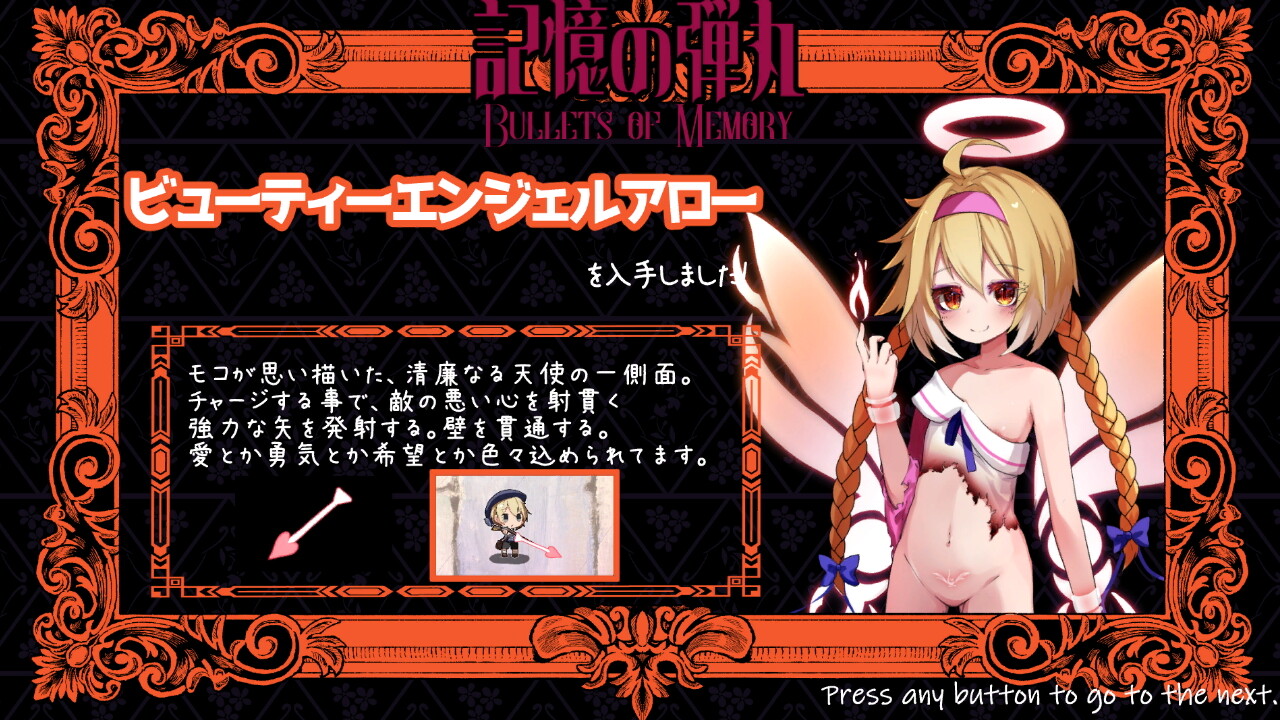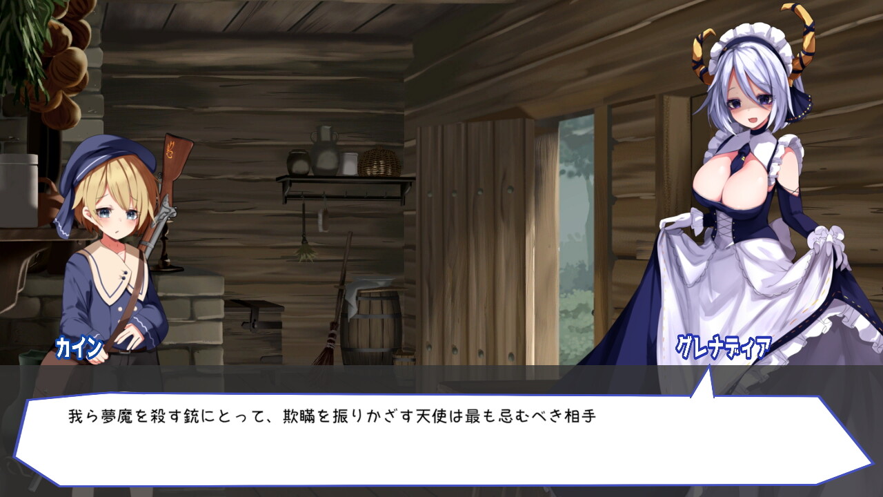 「天使を殺さなければならない」という強い使命感だけを残して記憶を失くしてしまった主人公カインとカインに付き従う淫魔のグレナディアが、情報を集めながら記憶を取り戻していくアクションSTG。