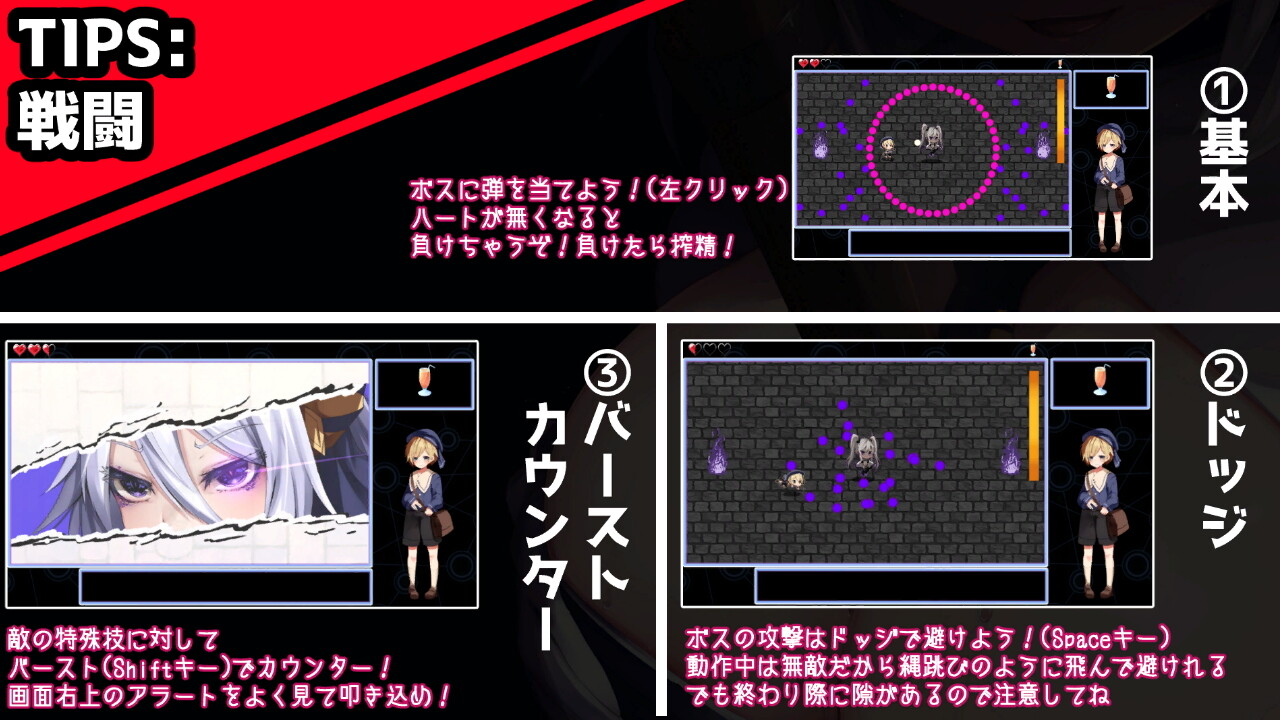 この中から好きな順番で攻略し、情報を集めましょう。ボスは属性や出自こそ様々ですが人の妄想から生まれた夢魔であり、隙あらばカインのちんぽを狙ってきます。エロシーンは戦闘で組み伏せられて負けた時とそれ以外の被弾で負けた時の2パターンずつあり、どれも淫魔らしくノリノリで搾精してきます。