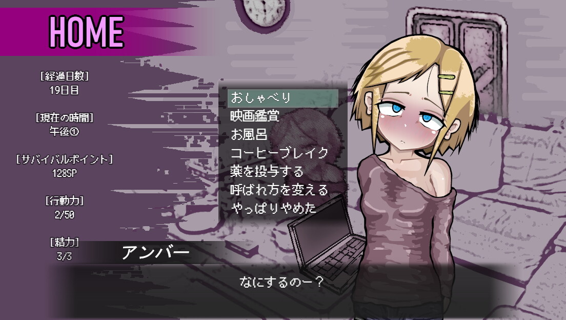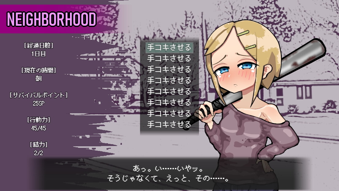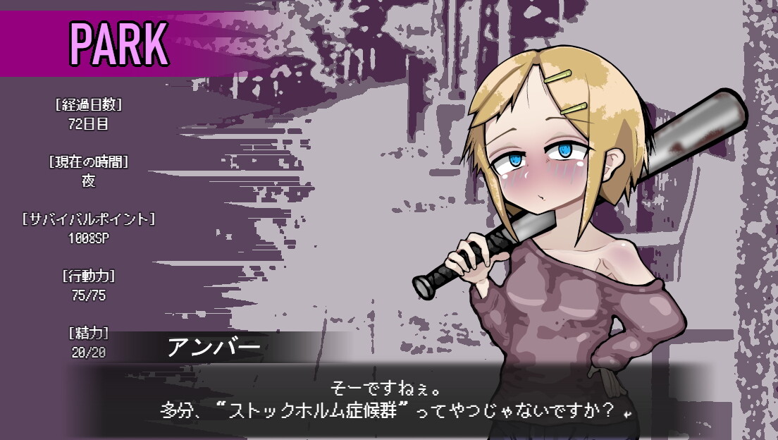 遂に食料が無くなり外出しなければならなくなってしまったとき、初めに出会ったのがヒロインのアンバーちゃんです。以降ゾンビになってしまうので血色のいい立ち絵はとても貴重な姿。