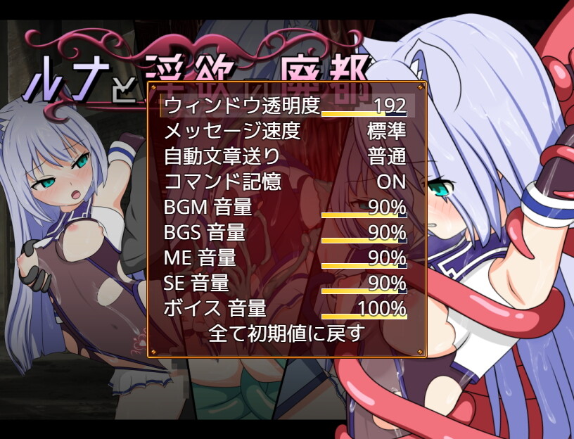 ツクールMVのゲームはデフォルトでBGM関係のスライダーが用意されていますが、ここでボイス音量やウィンドウ透明度などの調整ができます。細かいようですがメッセージボックスによってせっかくのエッチな絵が隠れてしまうのを防げるウィンドウ透過の設定は非常に重要だと思っていて、プレイヤーの利便性を考慮したゲーム設計が細かい部分から感じられます。