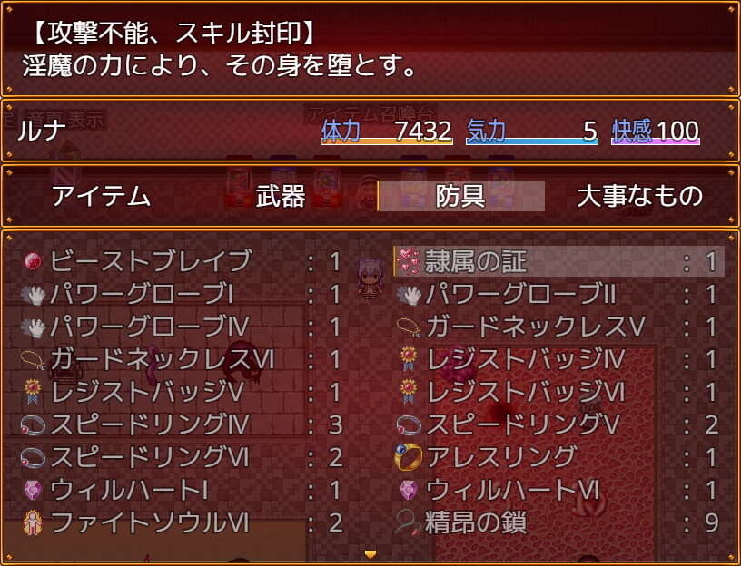 ゲームをクリアすると、回想ルームの人形から「ビーストブレイブ」「隷属の証」を入手できます。前者は敵に拘束されなくなるアクセサリで、後者は戦闘エロを楽しむためのアイテムです。