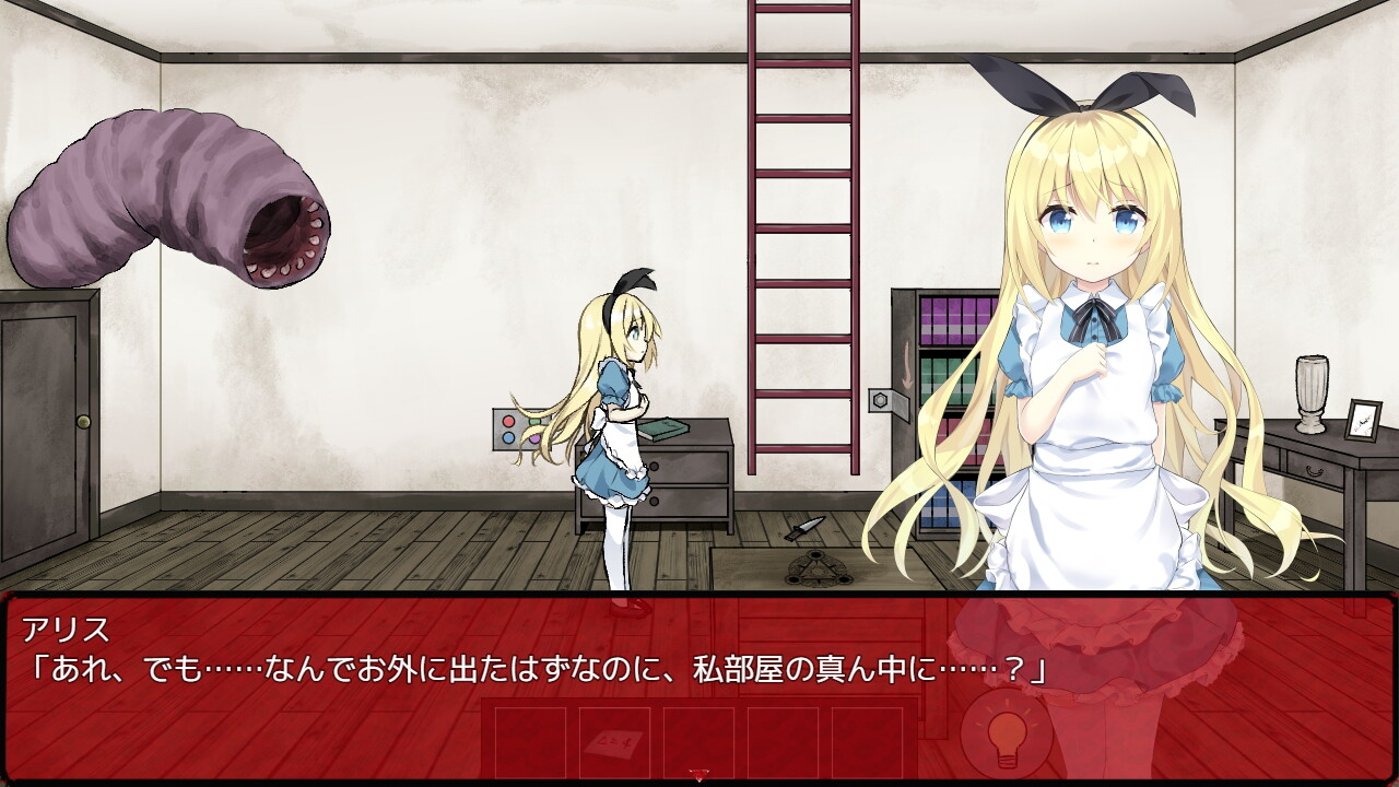見知らぬ部屋で目が覚めたアリスが、様々な謎解きをこなし危険でエッチなトラップをかいくぐりながら姉を探し出して脱出を目指す。