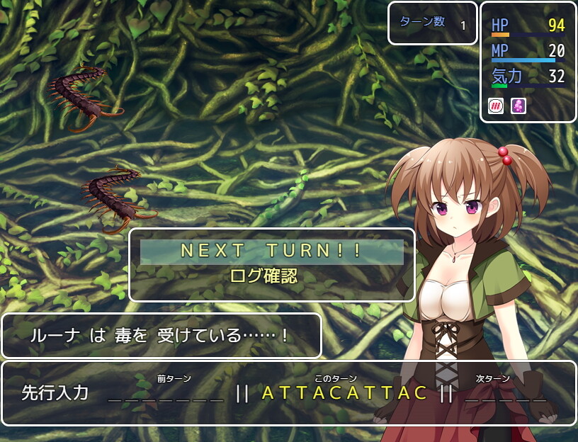 そして気力以外にも各行動には行動量を示す感じの英字が設定されており、ルーナは毎ターン10字ぶんまで行動します。