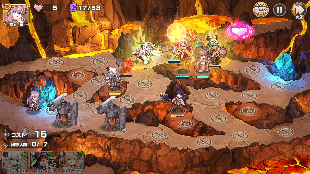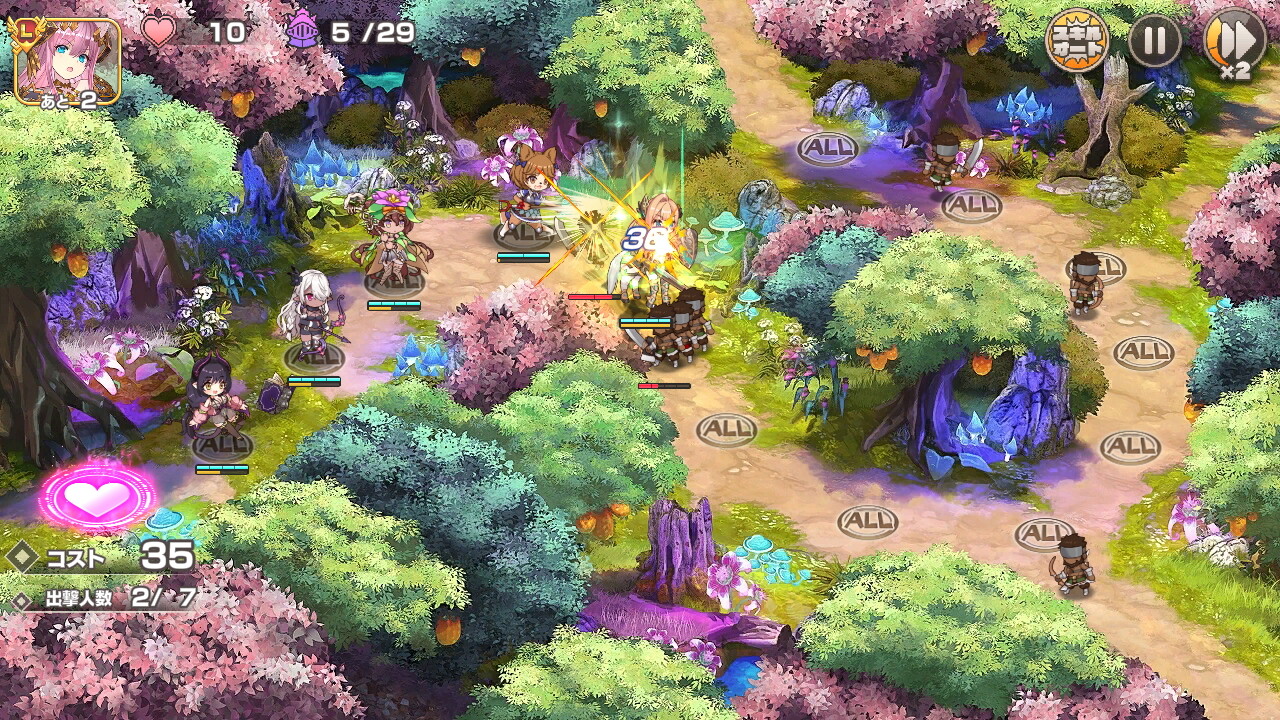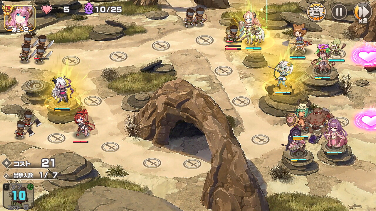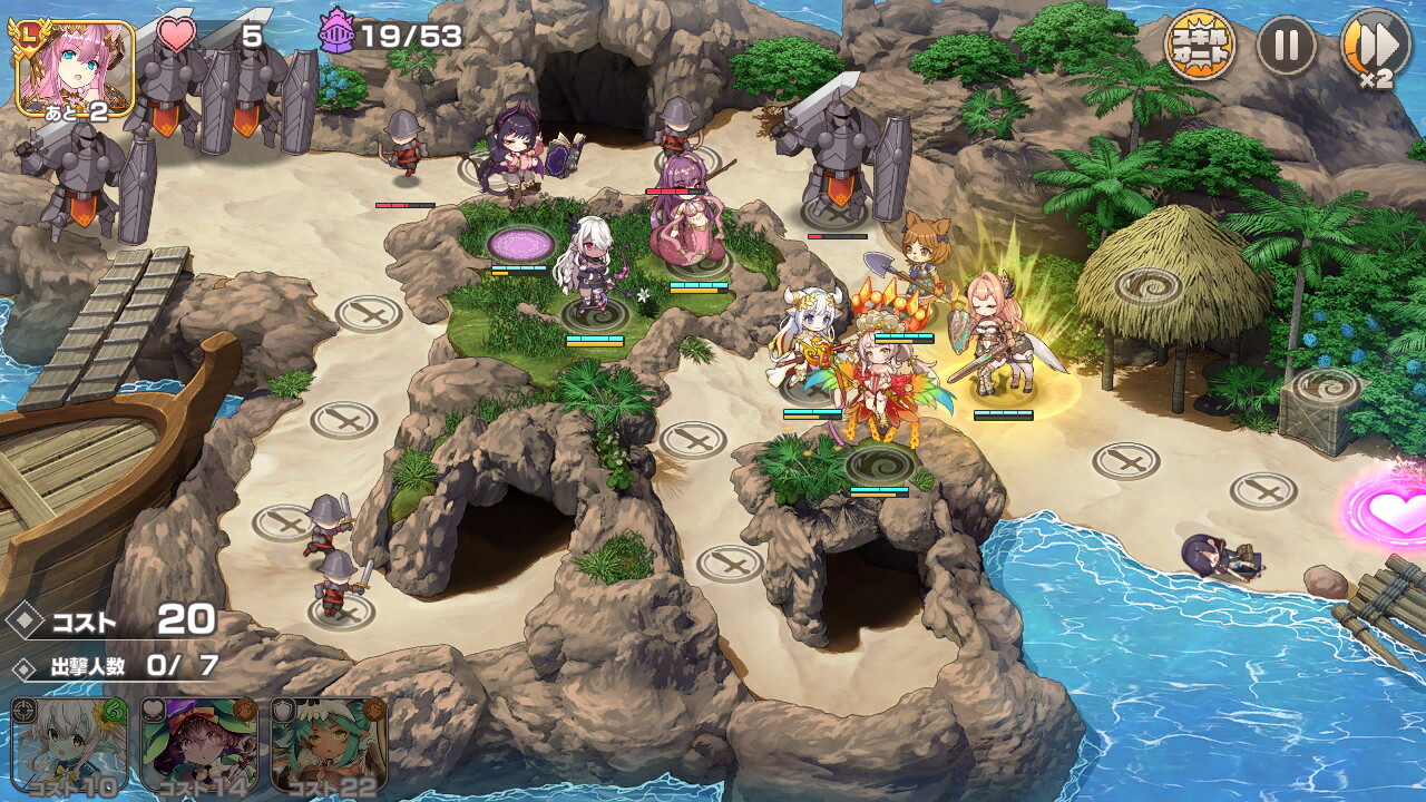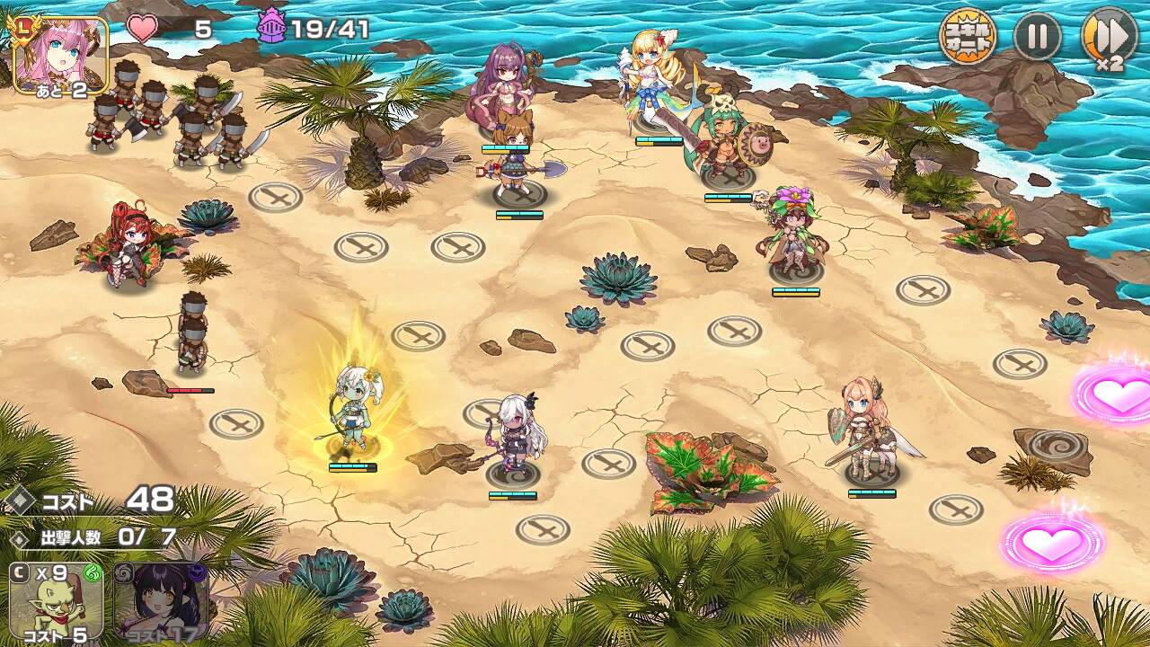 戦闘マップにはキャラクターを配置できる場所が表示されており、そこにコストを支払ってキャラを配置していきます。本作は経験者であれば全く苦戦するようなことはない簡単な難易度なので仮に初心者でも楽勝でゲームを進めていくことができるでしょう。