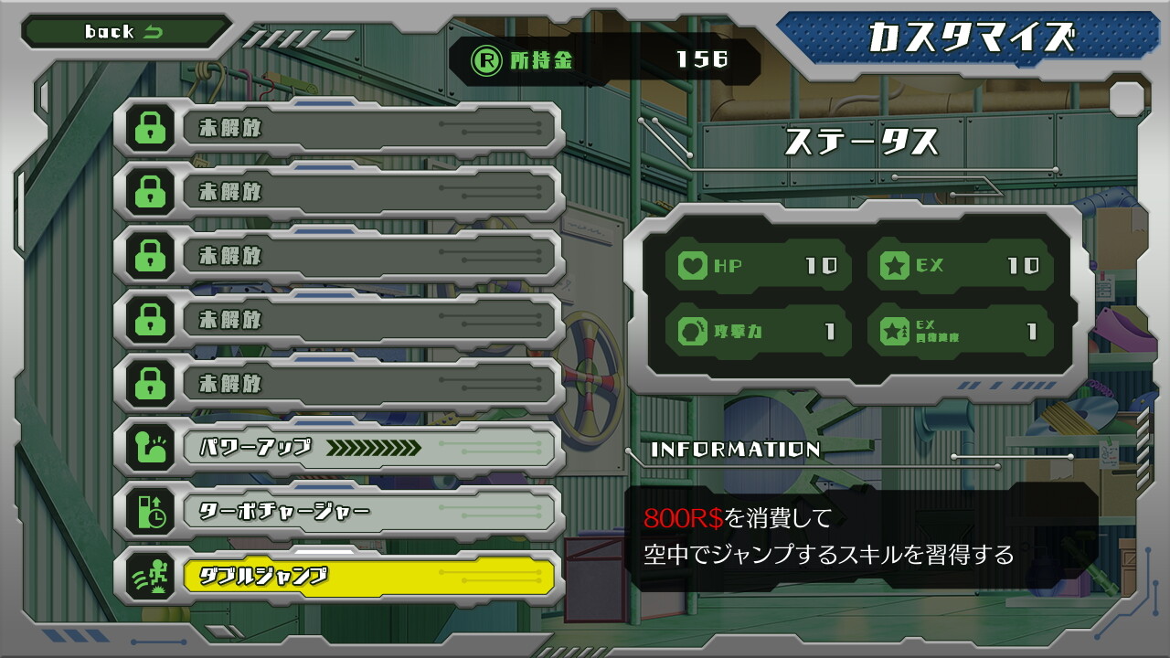 リスタのガレージにて。雑魚ロボットを倒すとお金をドロップします。これを集めるとリスタの能力を上昇させたり、新しいスキルを開放することができます。