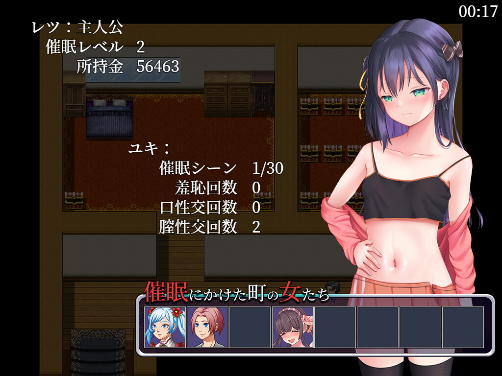 催眠術の講師ゼンザイの腕は確かであり主人公の才能も本物でしたが、ゼンザイは次のレベルの催眠術を教えるにあたって大金を要求してきます。強力な催眠術は人心を掌握するには十分で、生意気なユキにエッチないたずらをするのはもちろんの事、催眠術のレッスン代を稼ぐために街の人々にお金を出させたりすることも可能です。