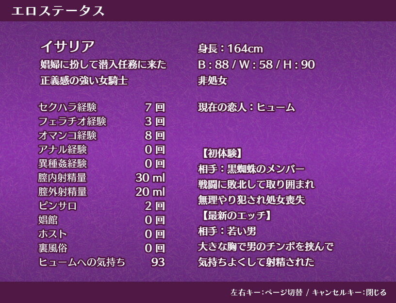 非合法薬物を摘発するという任務達成までに、果たしてイセリアは綺麗な身体・彼氏への純粋な愛情を保ったままでいられるのでしょうか。娯楽都市にはエッチな誘惑や罠がひしめいています。この女冒険者のようにこの世界の真理に気が付き活動資金などを娼婦としての活動の中から拠出するか、冒険者として地道にお金を稼いでいくかはプレイヤー次第となっています。