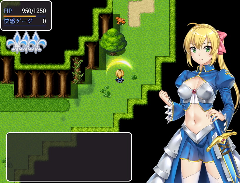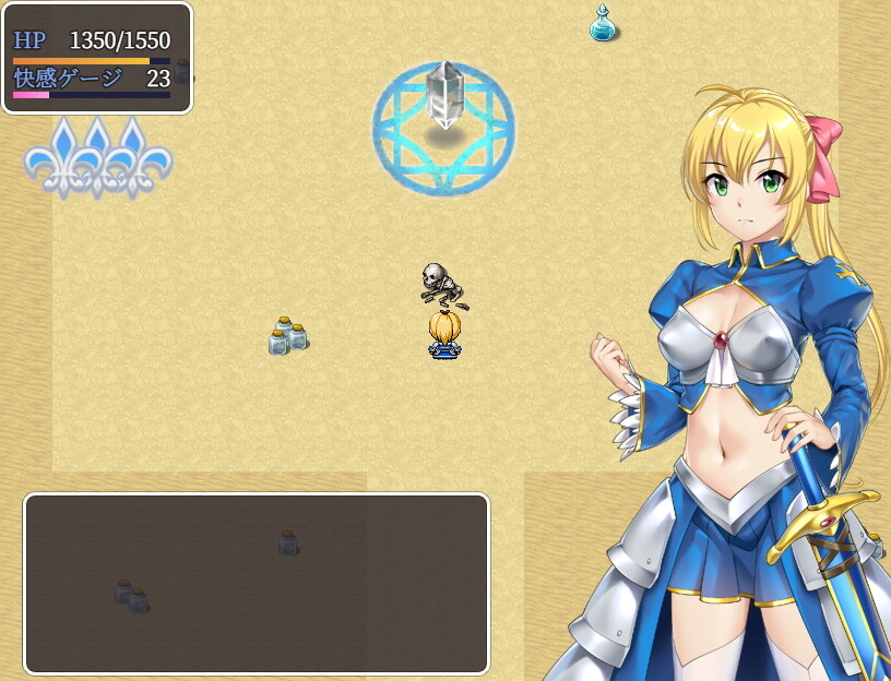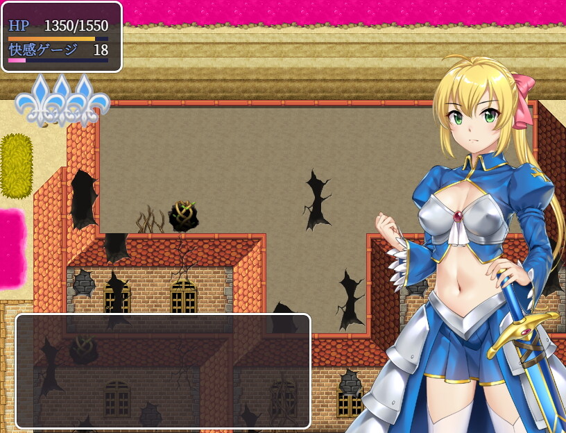 本作はフィールドマップを徘徊するゴブリンや触手などのエロモンスターを倒しながら(時にはエロいことをされながら)進んでいくゲームです。ダンジョンの最奥には魔王に至る為のクリスタルが配置されていて、その力を受けてリディナは強くなります。成長要素は貴重な消費アイテムによってステータスが上昇するか、装備品を更新することで上昇するしかありません。