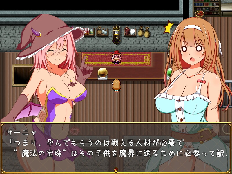 サーニャの目的は魔王である父への復讐。強力な戦士を魔界へと送り込み魔王を倒すことを目論むサーニャは、戦士を産みだす母体としてルルナを利用することに決めたのだ。交換条件として命を救ってもらったルルナはしぶしぶだがもう一つの目的「魔法の宝珠集め」の傍ら男に精液を恵んでもらう冒険に出る。