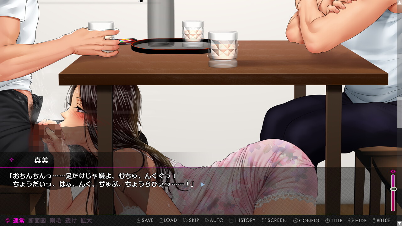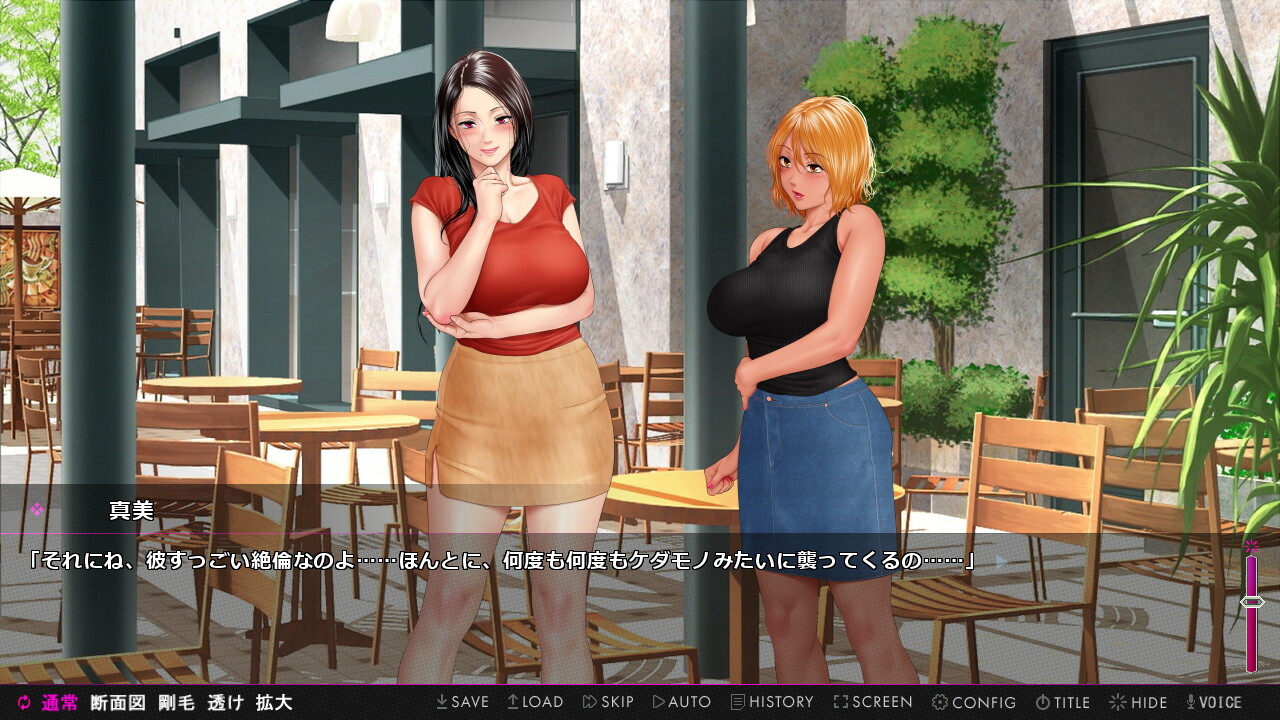 また目を引くのは画面左下の機能。エロシーンでグレー文字の部分が白く点灯し、切り替え式のこのコマンドをクリックすることで人妻との浮気交尾の差分を楽しむことができるようになっています。