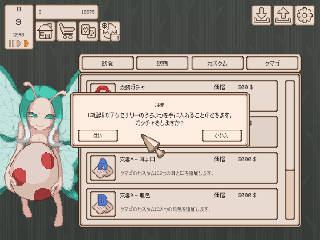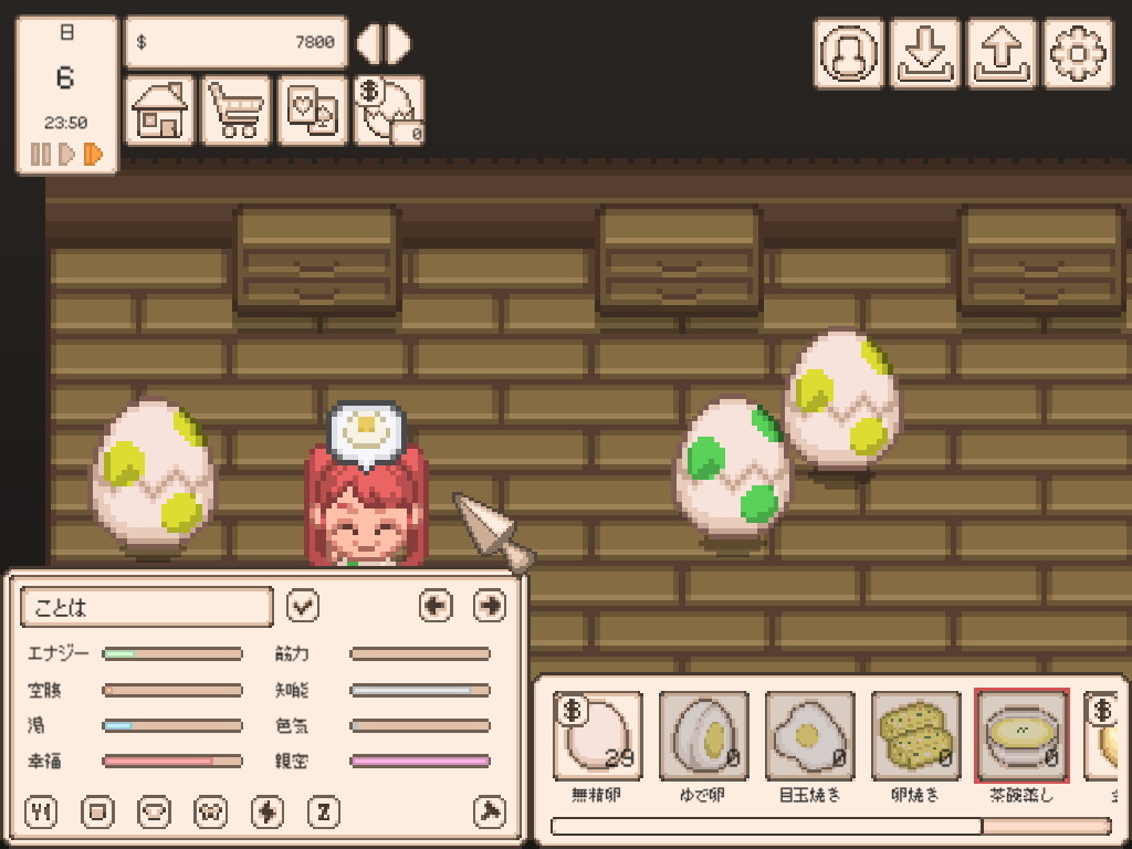 このゲームはチュートリアルが無いので体当たりで仕様や操作を覚える必要がありますが、お金の稼ぎ方が安定してくるとどんどんタマゴを増やすことができてお気に入りの見た目のタマゴハーレムを築くことができます。