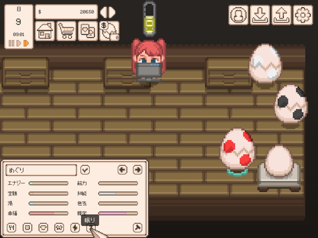 タマゴの体力でゼロになると強制的に眠る。空腹や渇き状態だと眠っていてもエナジーが回復しない。タマゴが眠ったら「Z」ボタンを押して殻に入れてあげないとエナジーの回復が始まらない。