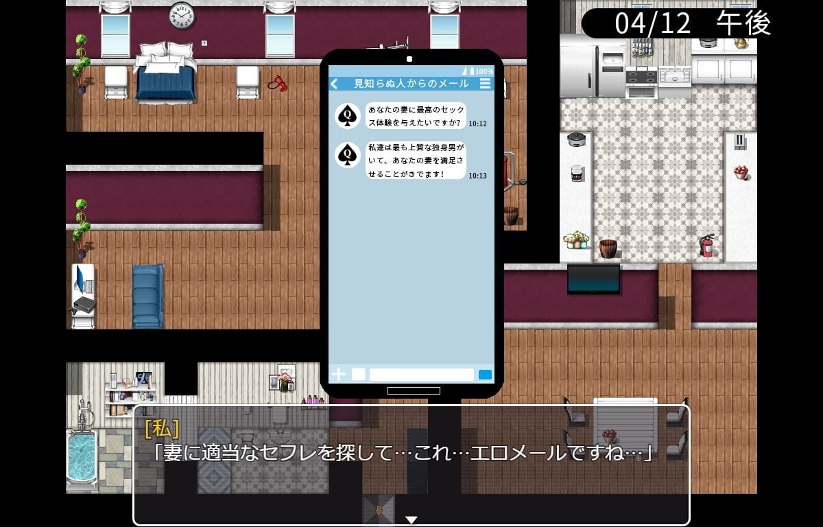 そんな中である日主人公に届いた怪しいメールの内容が気になってしまい、自分では満足させられないことを申し訳なく思ったのか彼は和子に他人とセックスして楽しんで欲しいと提案します。