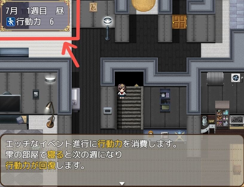 エロシーンを見ると行動力が1減り、0になると自宅で寝て翌週に再び活動となります。