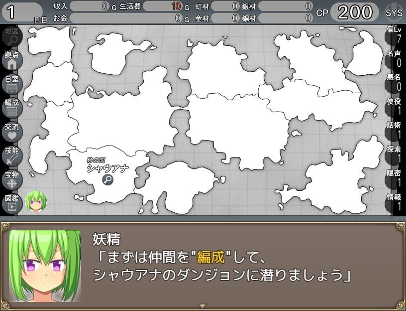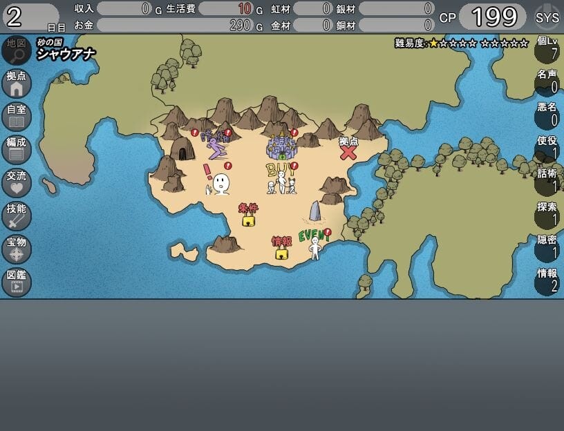 説明を忘れていましたがこのようにマップの中に色々な行動アイコンが表示され、1日1回どれかを選び、冒険者として行動を起こしていきます。時間制限などはありませんが活動資金が底をつかないよう気を付けましょう。
