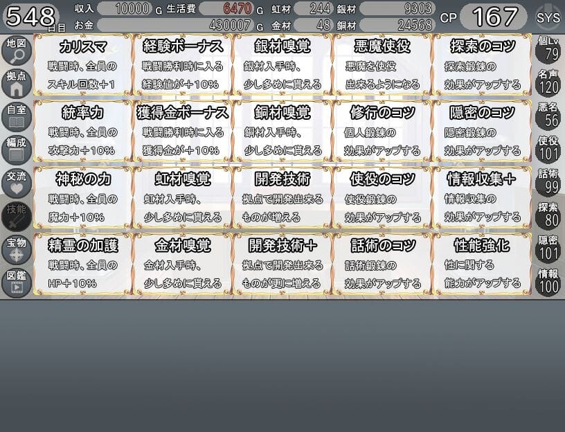 主にキャラクターを仲間にしたりスキルレベルが条件となって習得可能になるものが殆どです。
