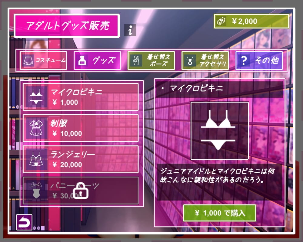 本作は過激なシーンを撮影するために小道具を買う必要があり、サヤちゃんの撮影の収益を使うことによって色々なグッズを購入できます。