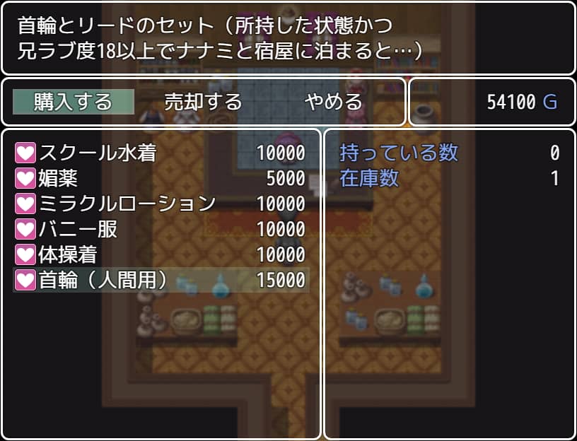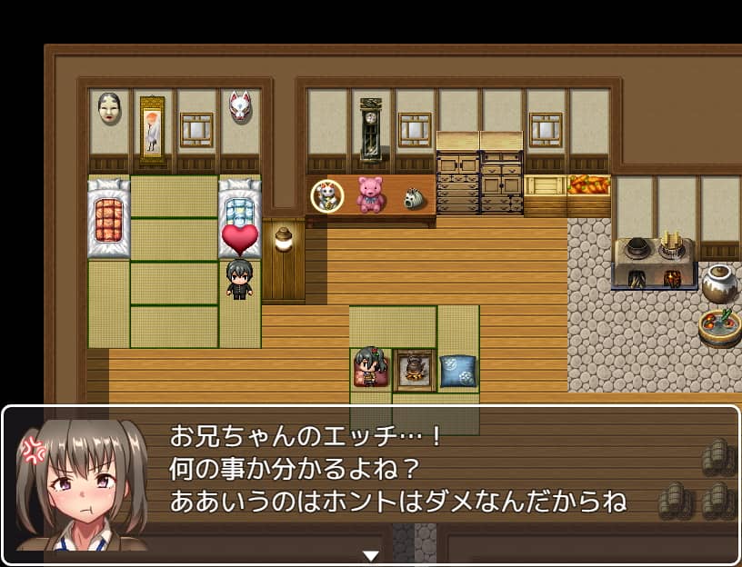このゲームはナナミの「兄ラブ度」を上げながら異世界のクエストを攻略していき、現実世界に帰る方法を探したり定住を決意したりするという目標のRPGです。定番のシンプルなツクールエロRPG然としていながらイベントフラグが視覚的に分かりやすかったりプレイヤーに開示されることでとても遊びやすく、回想ルーム等必要な機能も揃っており仕上がりが完璧な作品だと思いました。