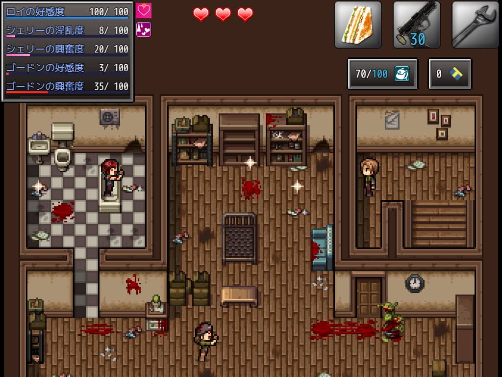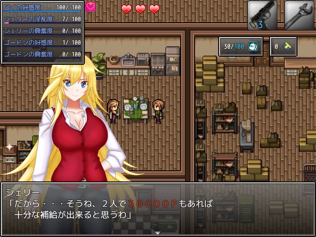 このゲームは2通りのNTRを楽しむことができる作品で、安全地帯で収入を得るために妻のシェリーをゴードンに抱かせるか、ロイ自身が危険を承知で辺りの調査と物資調達を行うかでルートが分岐します。