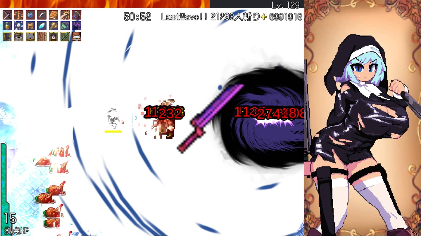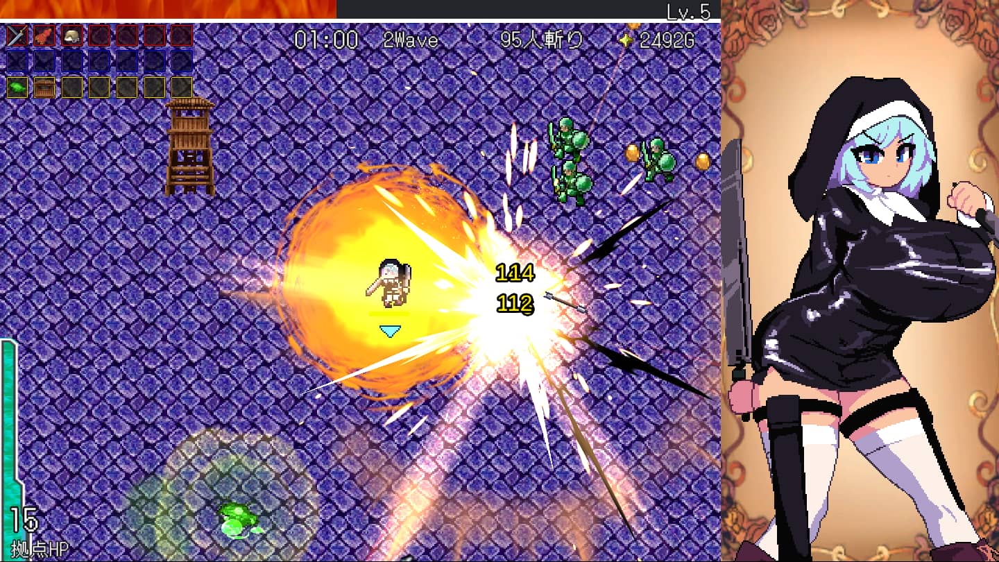 また大センカ独自のシステムとしてタワーディフェンス要素と「建物」という概念があり、プレイヤーキャラの体力とは別に本拠地の体力もあり、防衛施設を有効活用して拠点を守り抜く必要があるなど単純なヴァンパイアサバイバークローンゲームに留まらない奥深さも生まれています。