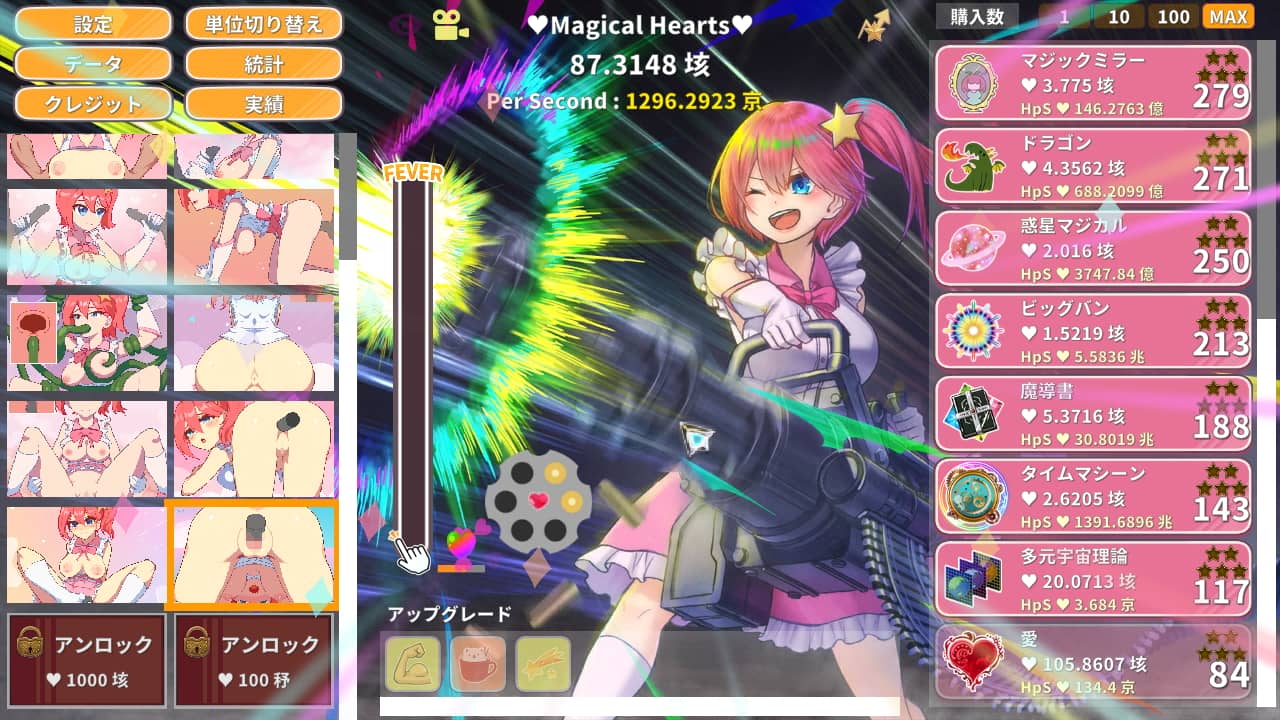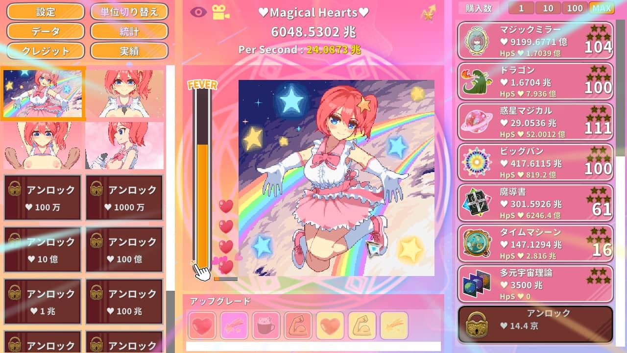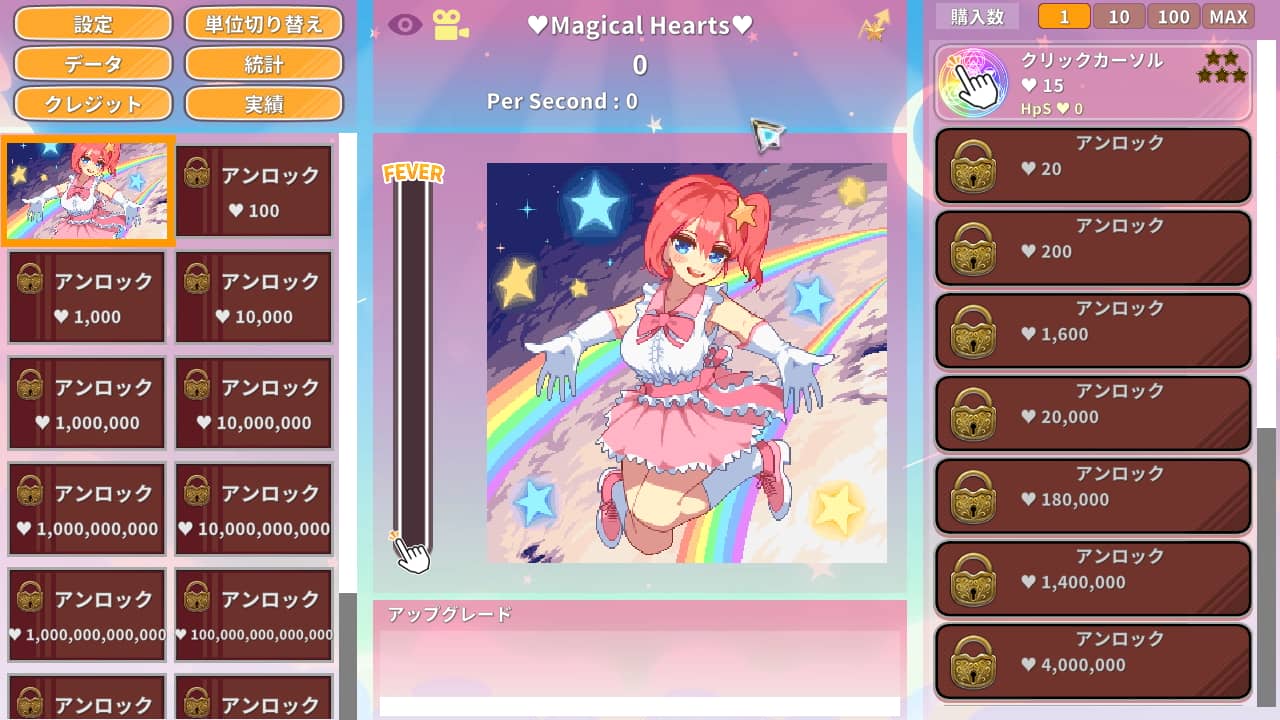 クッキークリッカーの特徴は数字のインフレによって天文学的な量のクッキーを焼けるというもので本作もそれに則り膨大な数のマジカルハートを集めることが目的であり、画面右側の支援施設をアンロックし数を増やしていくことで加速度的にハートを手に入れる効率が上がっていきます。