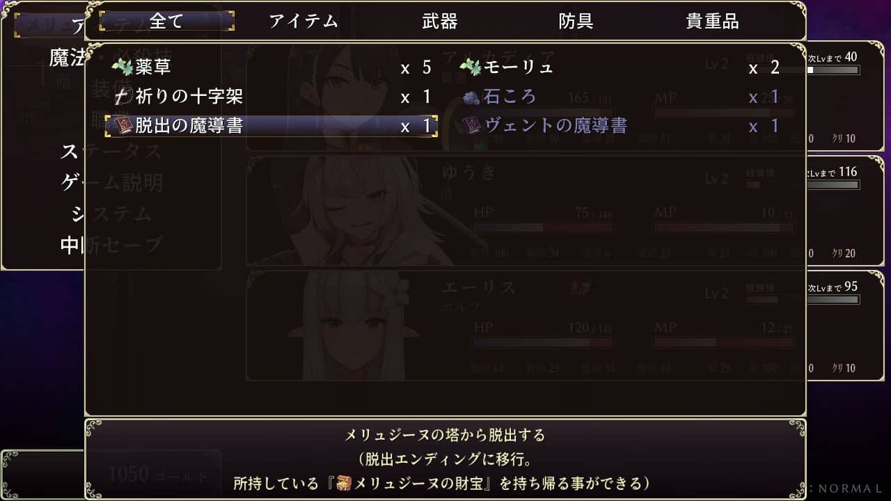 - メリュジーヌの財宝は全滅するとその冒険で入手したものは失ってしまいます。その為「脱出の魔導書」もしくは「ボス討伐後のフェアリーにお願い」してその冒険を終わらせるかゲームをクリアすることでしか引き継ぐことができないので注意しましょう。