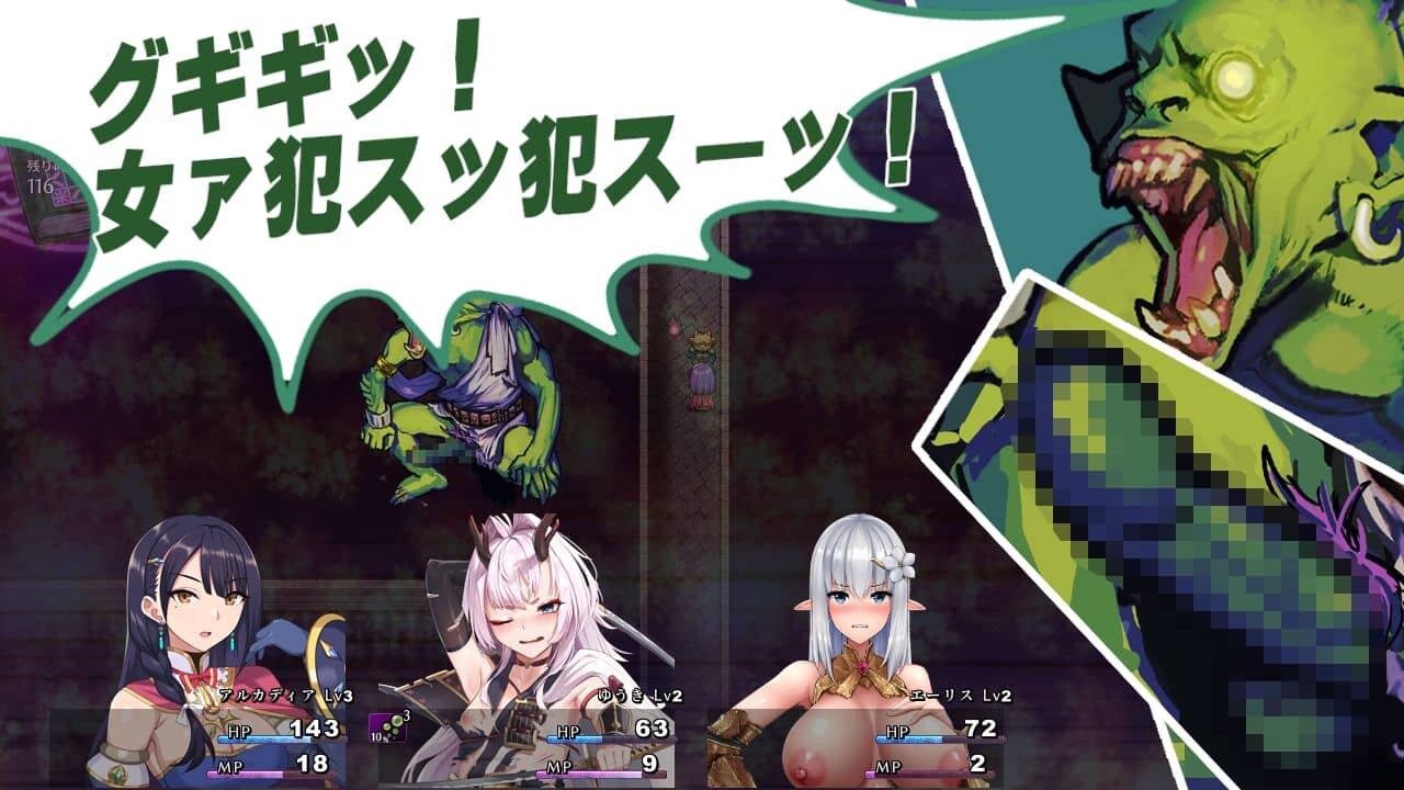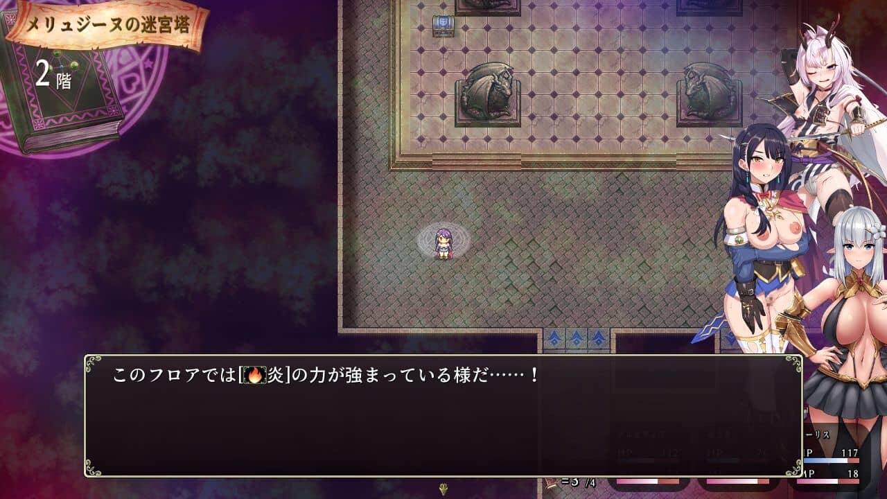 メリュジーヌの迷宮塔は戦闘中にモンスターに性的に襲われることも多々あります。ダンジョン内で全滅すれば主人公として選択したキャラが陵辱される末路が描かれますし、特別な休憩室で休むと様々なシチュエーションで犯される淫夢も見せられてしまいます。