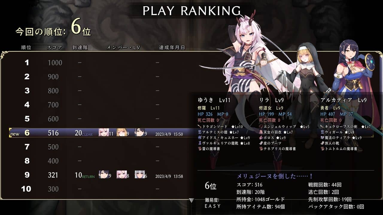 本作はローグライクらしくゲームプレイごとに成績がスコア化されて記録されます。