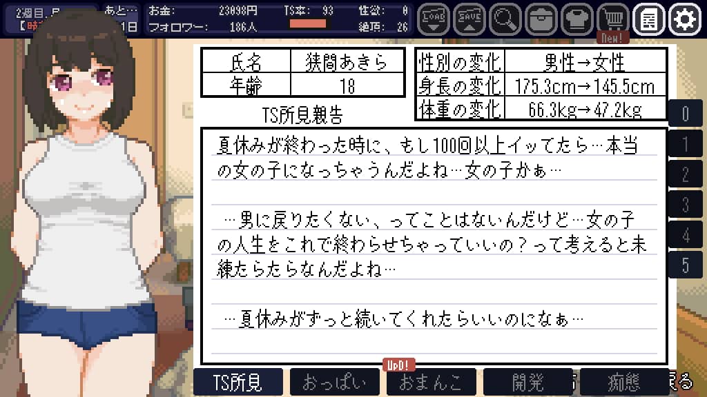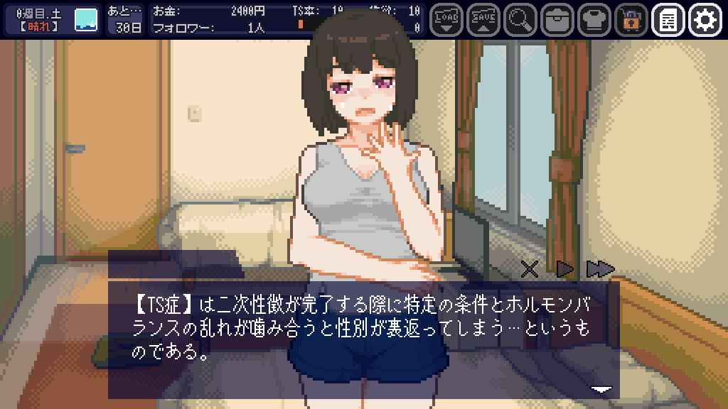 このゲームには恋人度やTS率というようなパラメータが設定されており、毎日の行動によってあきらのステータスが変動します。また性欲などの数値もあり元々性欲が増進する弊害もあるTS病も手伝ってあきらはプレイヤーに隠れてオナニーで欲求を解消したり、肉体を求めてくることもしばしば。