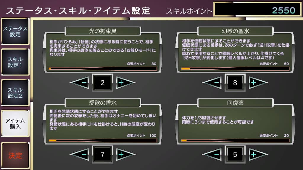 最初は逆立ちしても勝てないというのは恒例で、ゲーム終了時に付与される「スキルポイント」で主人公を強化していくシステムなのですが今回は新しい試み(だよね?)として「消費アイテム」が存在していて催眠や発情によるエロシーンの変化だったり体力のコントロールを行うことが今までとは違う点と言えるでしょう。