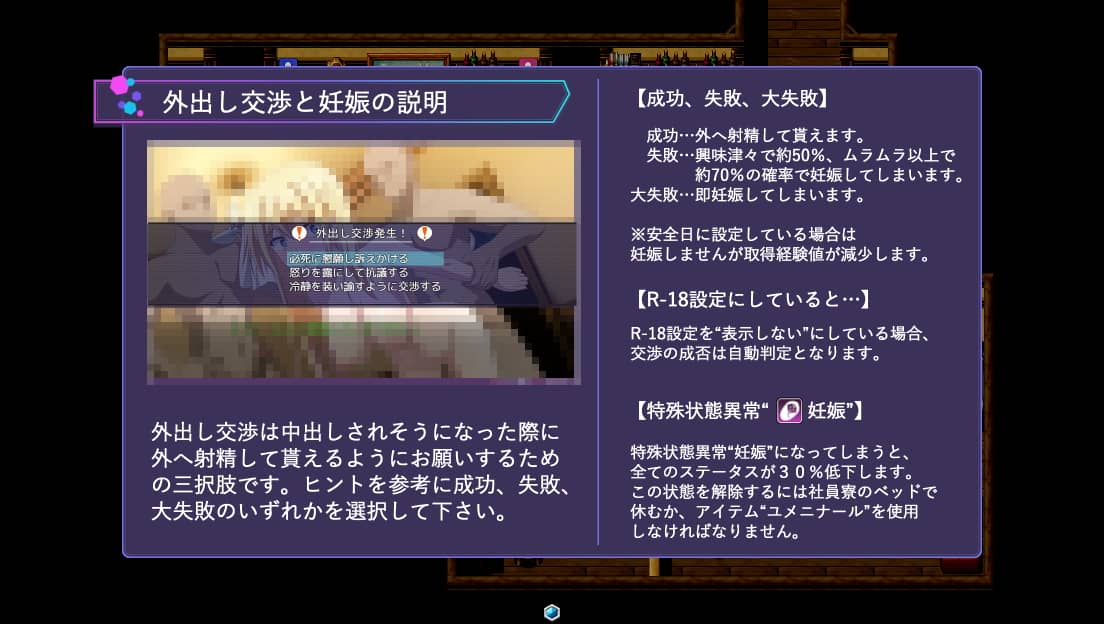 - 処女クリアを目指す場合、ボスがドロップするアイテムでH経験を上げることが可能で、これはカジノなどでも入手可能なのでエッチをせずに進む場合はこうした方向でHレベルを上げていくことになるようです。