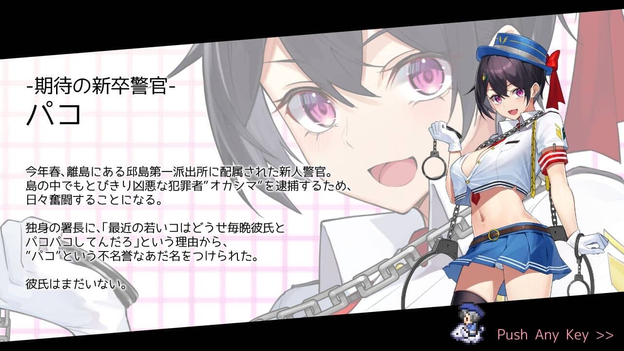 本作は女警官パコとなって島の治安維持に務めるゲームです。島の各マップをうろついているNPCの中にはセクハラを仕掛けてくる者や戦闘になる者もいます。