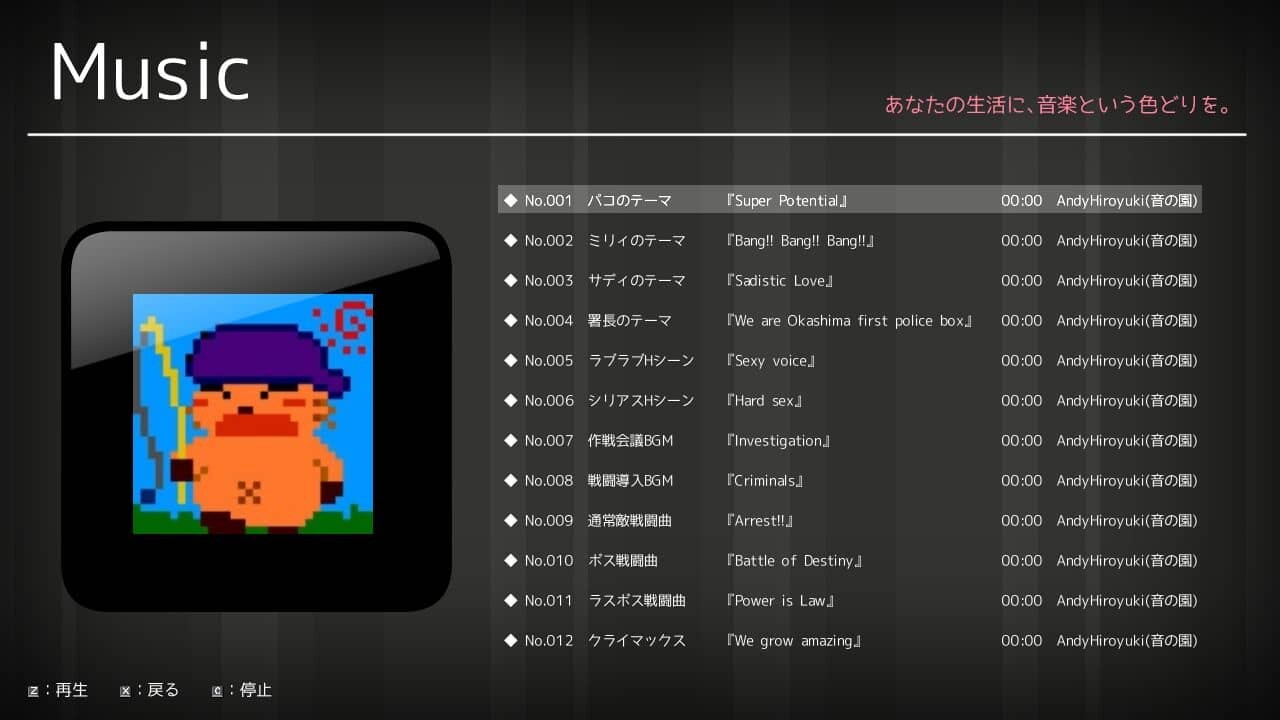 同人だと音楽はロイヤリティフリーだったり既製品の楽曲を利用することが多いですしオリジナルだったとしてもゲーム内から確認できるのは珍しいので新鮮に感じた機能でした。