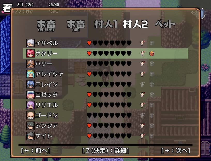 情報画面ではその日話しかけたかやプレゼントしたか、妊娠している場合はその情報がメニュー画面から確認が可能です。