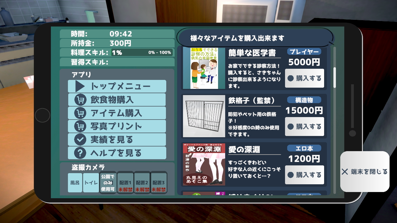 現像した写真を自由な場所に飾ったりさきに渡したりこのゲームはリアルタイム同棲シミュとしても面白いことが色々でき、さきと良好な関係を築きながら密かに盗撮や睡眠姦を繰り返すよろしくない父親を演じたり、虐待や監禁というようなえげつない毒親になることもできる自由度がウリだと思います。スタート時にさきの好感度が500からスタートして、ゲーム中のプレイヤーの行動で0から1000まで増減します。様々な行動がさきの父を想う気持ちに影響してくるので鬼父になるか「理想のおとうさん」になるかあなたの選択次第ってことですね。