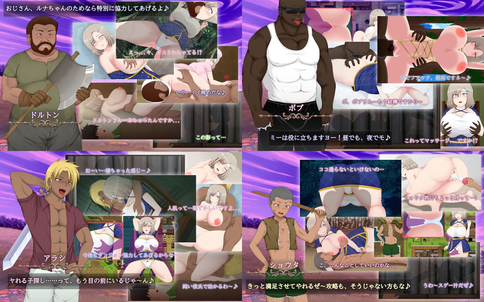 ちょっと確認できていないのですが、特に主人公単独で発生する田舎娘や魔女③以降のシーンが発生しないのでこの辺の発生条件にNTR系の何かが絡んでいるのかゲーム側のイベントフラグのミスなのかよくわかりません。時間帯、パーティの切り替えなどがあるので結構煩雑です。ただクエストはクリアしているのに進まなかったりと明確にゲーム側に原因があると思われるエッチシーンがあるので回想全開放したほうが早いと思います。夜這いイベントは主人公とルナのPTの時に発生するようです
