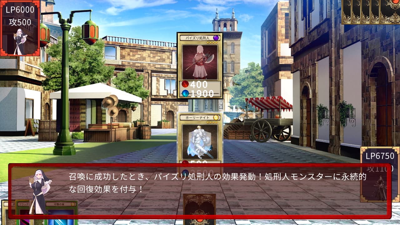 本作のシステムは毎ターンデッキから1ドローしてモンスターや魔法などをプレイする、遊戯王カードが簡略化されたようなスタイルで、上位のモンスターには味方をフィールドから取り除く生贄というコストが発生するようになっています。