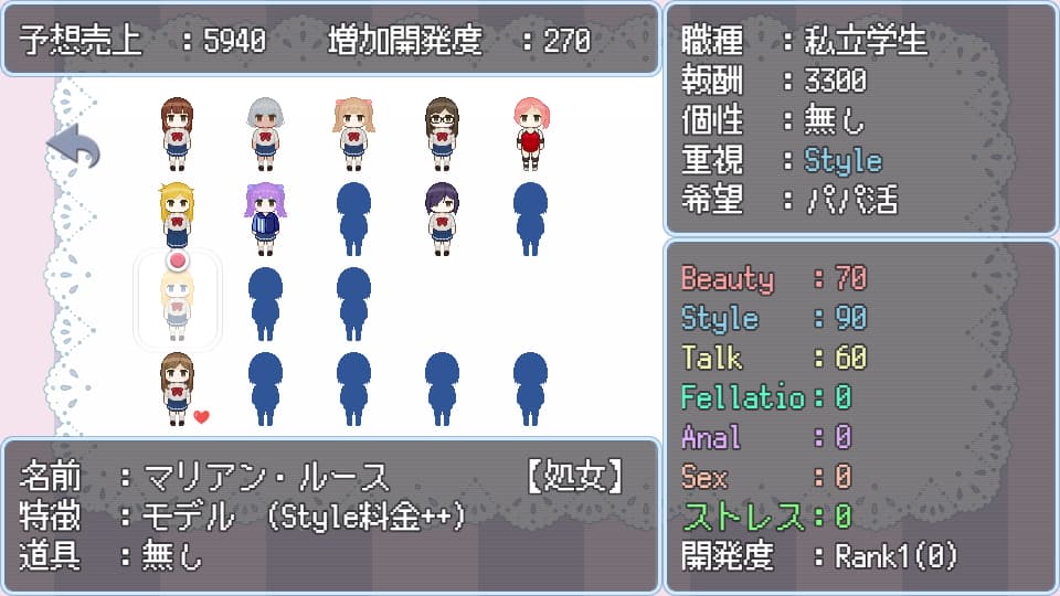 それが本作のもう一つの目玉である「パパ活マネジメント」で、客の需要に合わせて丁度良い仲間を紹介して荒稼ぎするというシステムになっています。