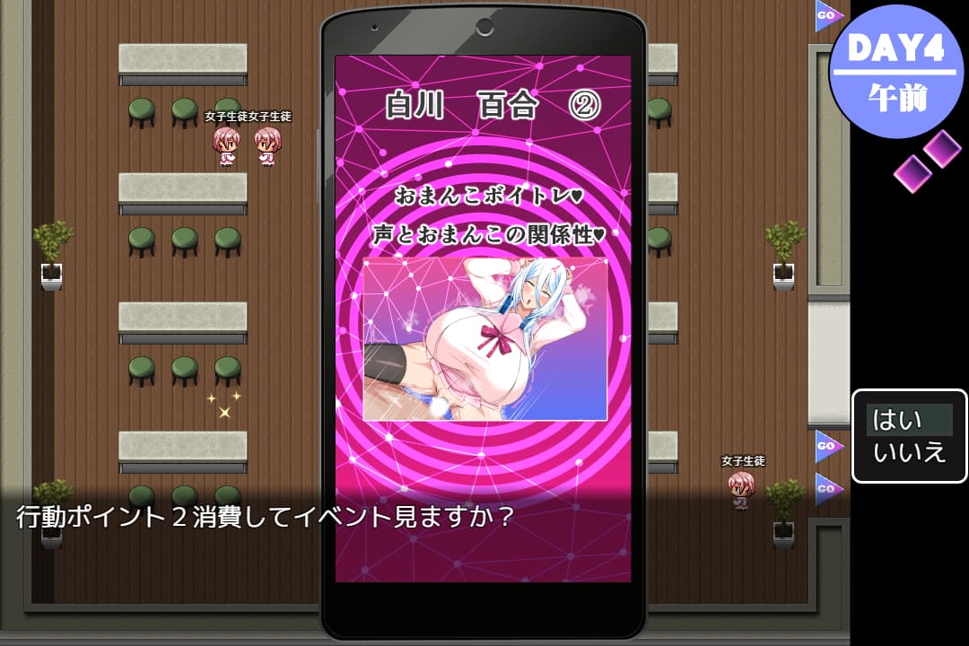 ゲーム的に催眠のタイプが2種類あって、狭い範囲だけ巻き込んだり対象を犯す為の催眠と、広範囲の催眠によって多人数にプレイを見せつけたり多くの人間の常識を改変するプレイが午前午後に区切られてそれぞれのヒロインのエッチシーンとして楽しむことができます。