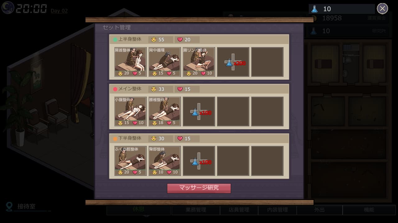 昼のマッサージ店経営で研究ポイントとお金を稼ぎ、マッサージの質を高めたり従業員の性能を鍛える投資を行います。