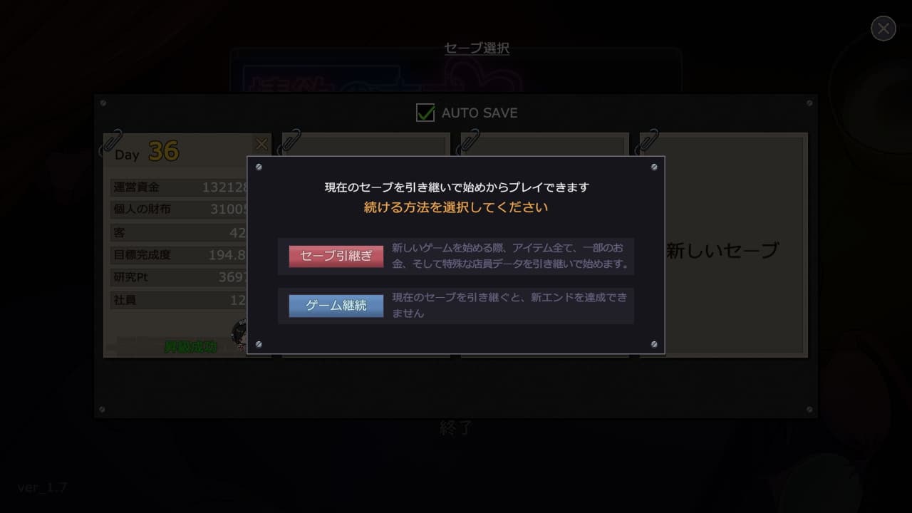 Ver1.07から旧バージョンのデータであっても引き継ぎ周回できる機能が追加され、今までゲームを塩漬けしていた人(私です)が再開するのに配慮された素晴らしいユーティリティ強化が行われています。この記事の攻略情報は古いですが、自動セーブの切り替えや引き継ぎ周回もアップデートされたのでゲーム部分に困ることはほぼなくなったと思われます。