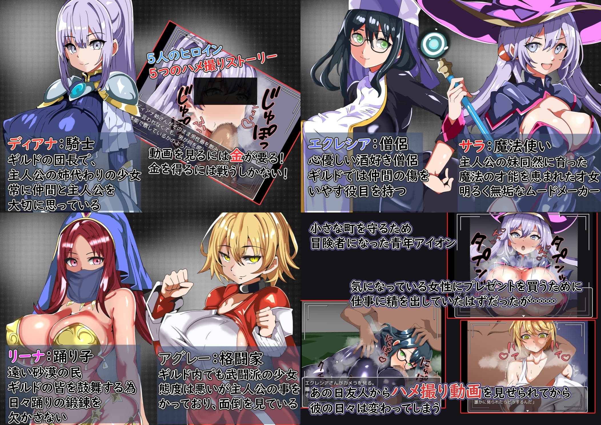 ヒロインのハメ撮り動画は街中にバラ撒かれていて、普段は凛然としている女性陣も道具屋グレイスの女に堕ちてしまったということは多くの人々にバレています。中にはハメ撮り撮影が売られている事を知りながら淫らに行為を重ねるヒロインも居ます。