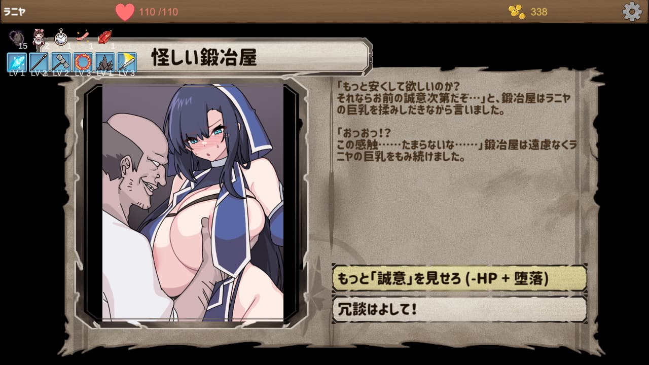- ヴィリカとラニヤどちらかを選択してゲームを開始します。初期性能や発生するイベントが変わりますが、タイトル画面の「トリヒキ」のお金がない序盤は自動回復性能があるラニヤの方が進めやすいと思います。