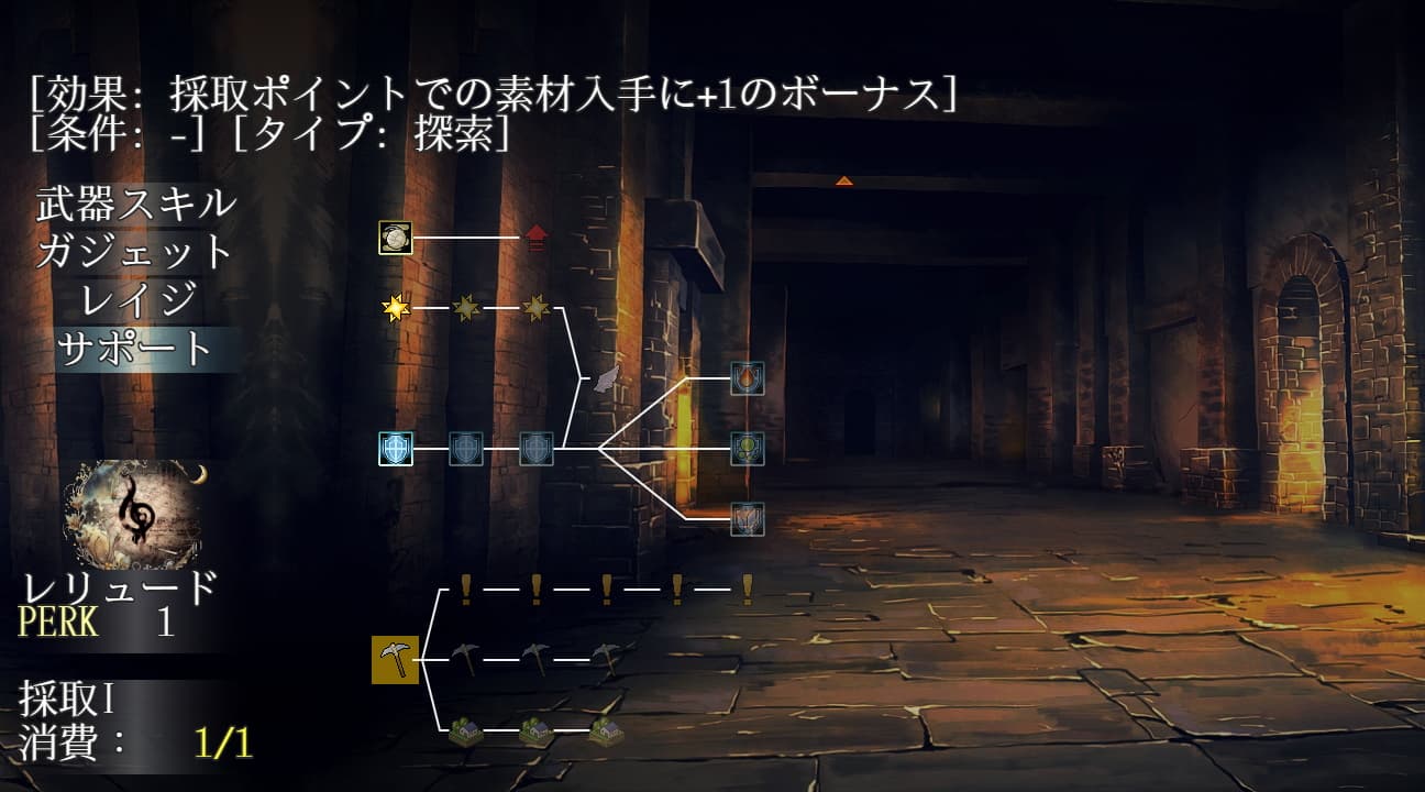 序盤に戦闘系を取得するのは正直あまりおすすめしません。装備やガジェットを作らないと効果を発揮しないので中盤以降に振っていくのがいいでしょう。序盤は回復クリスタルの効果アップやアクション回数が増えるサポートのツリーから探索系のスキルボーナスを獲得していくべきだと思います。また主人公やベータの攻撃命中率はパークの取得を前提としているのかやや外しやすくデザインされています。ゆくゆくは命中率補正のかかるスキルにも振っていくべきでしょう。