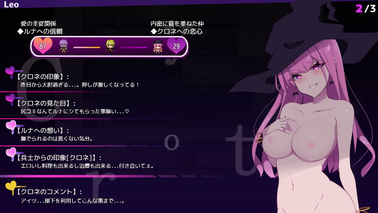 W寝取られと自称しているように男は女淫魔に、女は男淫魔に篭絡されお互いを裏切ってしまうというNTRと逆NTRが楽しめたクリプトの引き裂きのコンセプトが受け継がれ、本作は大魔法使いの血筋ではあるものの落ちこぼれなレオとその従者ルナの固い絆をクロネたちが崩しにかかるというもので、男視点で女性に誘惑されるエッチシーンと、ヒロインが催眠や隷属魔法をきっかけとして精神支配を受けたり快楽堕ちするエッチシーンの両方が体験できるのが特徴です。