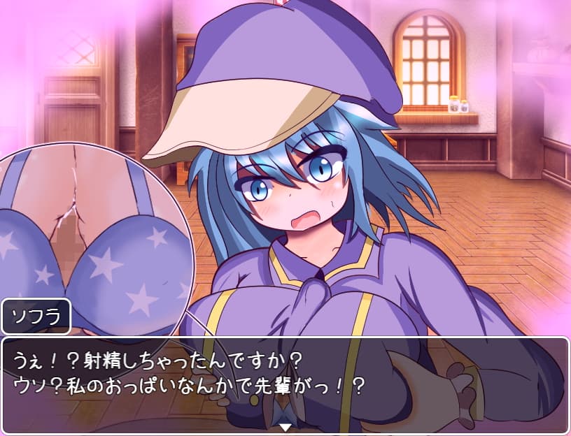 本題に戻ると今回も戦闘中に色仕掛けされて敗北射精させられる本番なしのやつです。登場する女の子はブラジャー・パンツ・ソックスの3属性に分けられていて大体想像通りのプレイで主人公を責め立ててきます。主人公は有望な退魔士のエースだったのですが、ゲーム冒頭でザコ退魔士と能力が入れ替わってしまうというハプニングが起こってしまったためこうした女の子のエッチな誘惑への耐性が無くなってしまい、チャーミクロスの四天王はおろか訓練中の後輩にすら負けるおそれがあるほど弱体化してしまっています。