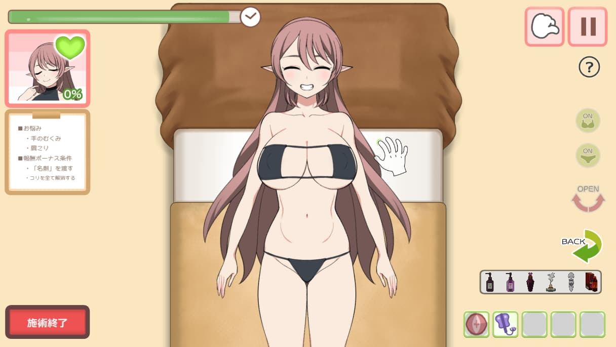 □や○のマッサージポイントは対応する右クリックの施術を正しく行わないとミスになるので画面右上の"?"アイコンから対応する施術をよく確認して実行してください。間違っても左クリックでさすればいいようでした。